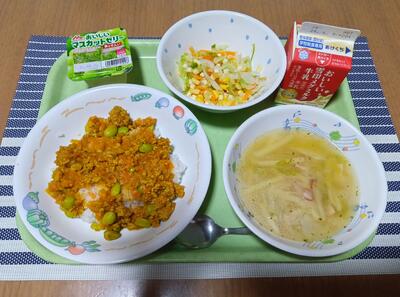肉味噌丼、牛乳、もやしとコーンのおひたし、
