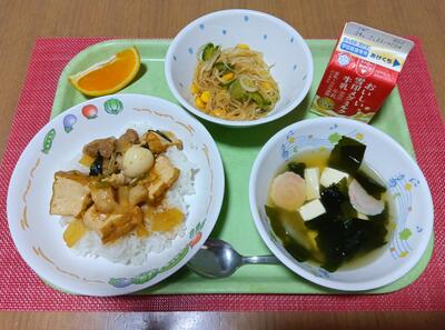春雨のピリから炒め、かきたま汁、河内晩柑