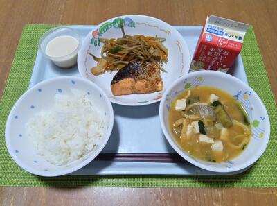 ご飯、牛乳、マスの照焼、五目きんぴら、
