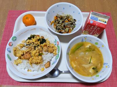 ツナそぼろ丼、牛乳、小松菜のおひたし、
