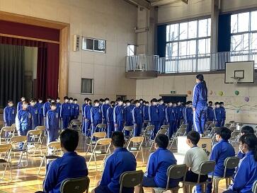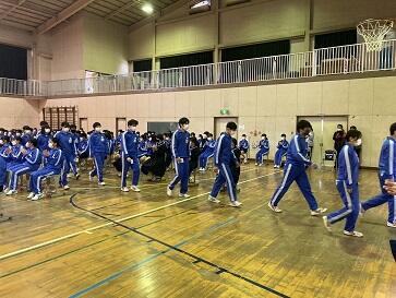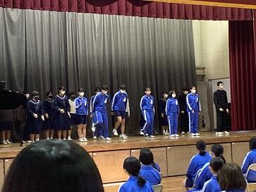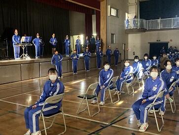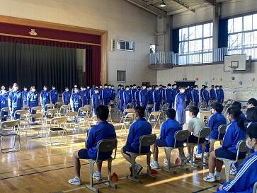 12月23日(木)冬季休業前集会と進路激励会が行われました。1・2年生から激励の言葉と激励の品を贈り応援をしました。新応援団は今日がデビュウーです。堂々とできました。3年生からは代表の萩原君がお礼の言葉と自分なりの学習方法を教えてくれました。後輩たちも参考になったことと思います。明日からは冬休みとなります。3年生は年明けそうそうから始まる入試に向けて頑張って下さい。そして、全校生徒が健康で安全な冬休みを過ごすことを願っています。