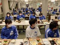 4月8日(金)今日から給食がスタートしました。今日のメニューは 川中ポークカレー 牛乳 フレンチサラダ フルーツヨーグルト でした。1年生のみなさん、川間中の給食はどうだったでしょうか?カレーは6種類ものスパイスを使ったピリ辛のカレーですが、川間中人気ナンバー1のメニューです。今日は油井先生の初給食でもあり、高山先生もかけつけてくれました。ごちそうさまでした。