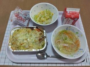 3月9日(水)3年生は中学校生活最後の給食となりました。メニューはチキンドリア キャロットドレッシングサラダ ジュリエンヌスープ プチガトーショコラでした。川間中特製ドリアはグラタン皿にごはん、チキンクリームソース、チーズを順番にのせて焼き上げました。卒業デザートとしてガトーショコラでお祝いしました。