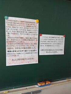 3月24日 修了式・辞校式が行われました。放送による表彰があり、続いて修了式。修了式では、校長先生より1年生岡田帆乃佳さん、2年生西野凱くんに修了証証が手渡されました。岡田さんと西野くんは1年間の成果と課題を話してくれました。校長先生の話で「こつこつ努力する勇気をもとう」という話がありました。修了式後、生徒指導主任より春休みの過ごし方についてとダニエル先生が川間中最終日だったのでお話をいただきました。