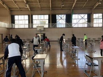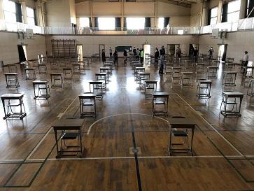 4月10日(金) 昨日降った雨とは打って変わり青空が広がり、暖かい日となりました。昨日、マチコミメールやホームページでお知らせしたように、月曜日から分散登校が始まります。担任の先生からも電話連絡が入ったと思います。今日は、体育館に机を運び分散登校の準備をしました。1年生月曜日、2年生火曜日、3年生水曜日となります。時間や持ち物を再度確認して、安全に注意して登校してください。