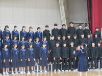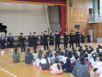 11月13日(木)、3年生が、地域交流活動の一環として尾崎小学校を訪問し、歌声の発表会を行いました。この日のために、3年生は市内音楽会で発表した2曲を中心に、心を込めて練習を重ねてきました。訪問先の小学生の皆さんにも楽しんでもらえるよう、誰もが知っている曲を盛り込んだオリジナルメドレーを披露しました。澄んだ歌声と、練習で培った真剣な表情からは、音楽の楽しさ、そして日頃の学習の成果が伝わったことと思います。