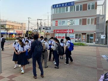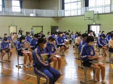 後半はグループに分かれて、校舎の見学をしました。食堂や進路室といった中学校にはない設備に目を輝かせていました。再来週に控えた班ごとの高校訪問に向けての楽しみが増す有意義な時間となりました。