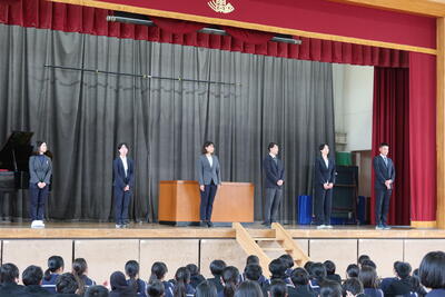 4月19日(金)、新入生歓迎会が行われ、2・3年生を中心に、日常生活、委員会、部活動等の紹介をしました。それぞれ工夫を凝らし、新入生に喜んでもらいたいという気持ちが伝わってくるものでした。新入生は、感謝の気持ちを3年生に教えてもらった校歌で示しました。受け入れる側、受け入れられる側が共に、あたたかい気持ちになる場となりました。
