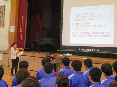 本日,6校時に3年生を対象とした食育の授業が行われました。本校の栄養士の高山先生を講師に迎え,受験に向けて朝食の大切さや食事による栄養の大切さについて学びました。なかなか朝ご飯を食べる生徒が少ないことや,食事の偏りがあることなど生徒たちの中でも驚きと学びのある時間となりました。