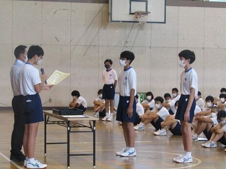 最初に体育館で生徒会の企画・運営による全校集会を行いました。その中で葛北大会や夏休み前に実施した全校統一テストの表彰も行い、各部・各クラスの栄光を讃えました。その後、生徒会長、生徒指導主任の鈴木駿也先生、校長先生からこれからの生活のことについてお話がありました。特にこの9月以降は行事ややらなければならないこと多く、とても慌ただしくなりますが、一人一人が目標に向かって全力で取り組んでいってほしいと思います。