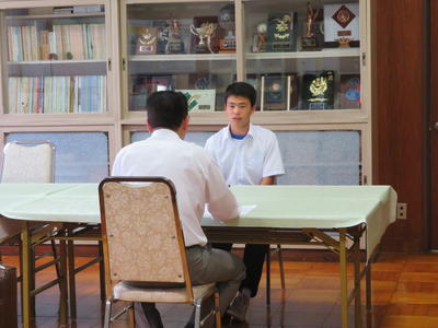 本日4人の生徒が面接を行い,皆緊張した面持ちで受け答えを行っていました。適度な緊張感と,未来への活力を得られる面接だと思います。