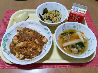 麻婆丼、牛乳、わかめともやしのサラダ、