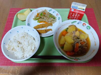 発芽玄米ご飯、牛乳、肉じゃが、