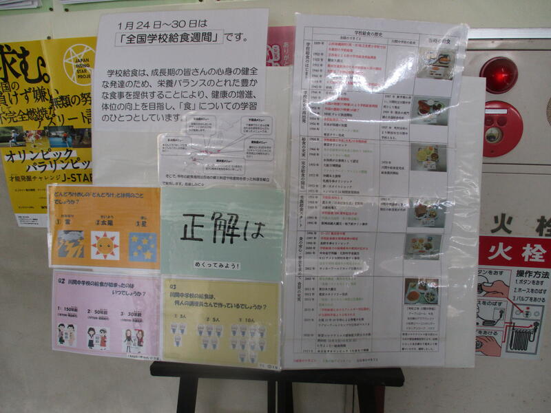 1月24日(月)今週は全国学校給食週間です。昇降口前には給食の歴史や、給食に関するクイズなどが掲示されています。初日の今日は鳥取県のメニューです。どんどろけ飯、かにかまの和え物、あじのつみれ汁、抹茶豆、牛乳でした。どんどろけ飯は豆腐の入った五目ご飯です。また、あじの漁獲量は全国4位。らっきょう、梨、すいか、ずわいがになどもよく採れます。