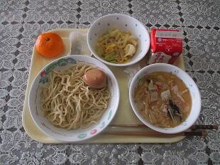1月25日(火)今週は全国学校給食週間です。今日は熊本県で愛されている料理が登場しました。今日のメニューは とんこつラーメン 牛乳 卵のしょうゆ煮 白菜の柚子香和え いきなり団子 みかん です。 熊本のとんこつラーメンにはきくらげが入っていて鉄分が豊富なきのこです。今日はつけめんでいただきます。いきなり団子はさつまいもを使ったおやつとして家庭で食べられていました。今では和菓子屋をはじめお土産でも人気だそうです。