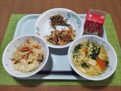 こぎつねご飯、牛乳、じゃが芋の金平、