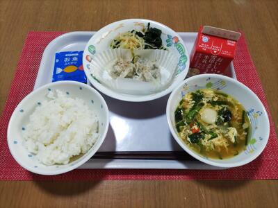 肉味噌丼、牛乳、もやしとコーンのおひたし、