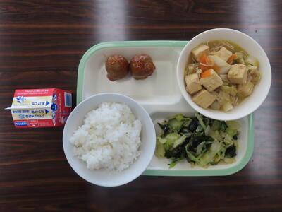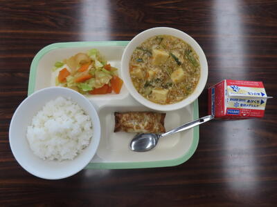 本日の献立は、ご飯、牛乳、四川豆腐、棒餃子、きゃべつのピリ辛漬けでした。美味しくいただきました。