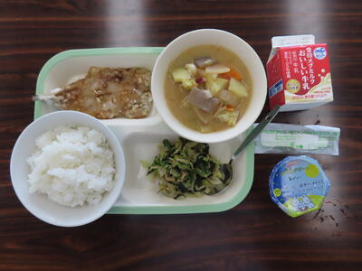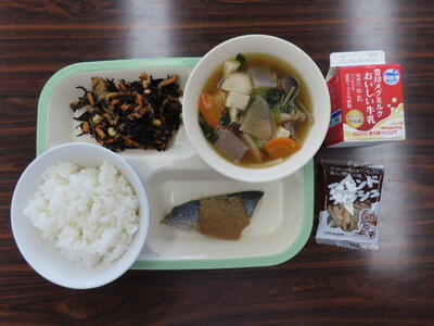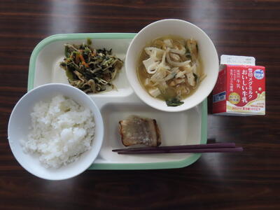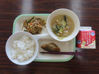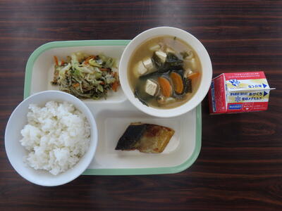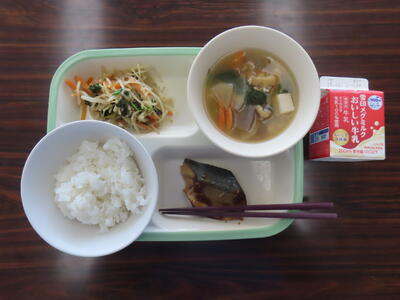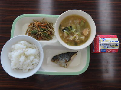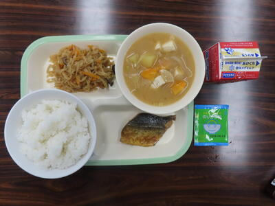 本日の献立は、ご飯、牛乳、小松菜と大根のみそ汁、さばのねぎ塩焼き、五目きんぴらでした。美味しくいただきました。ご馳走様でした。