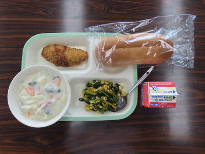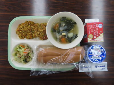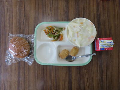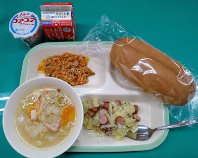 本日の献立は、丸コッペパン、牛乳、ミネストローネスープ、キャベツ入りメンチカツ、シグナルソテー、チーズでした。美味しくいただきました。ご馳走様でした。