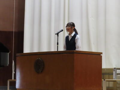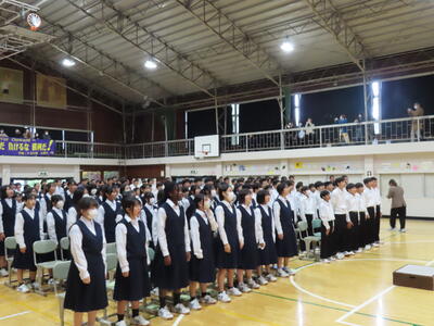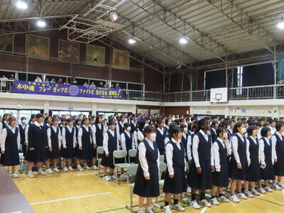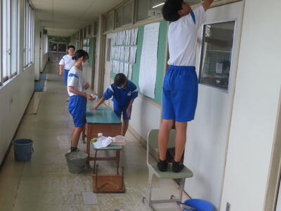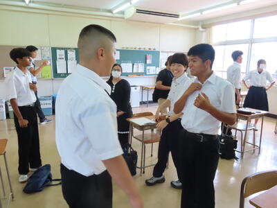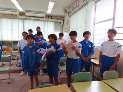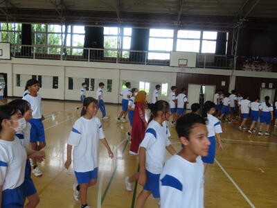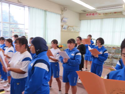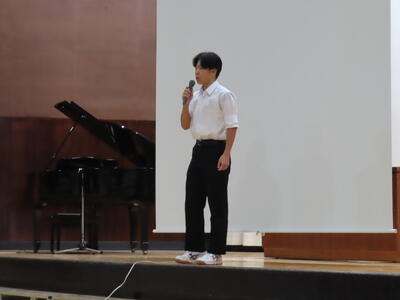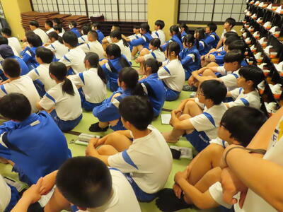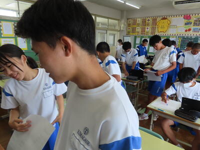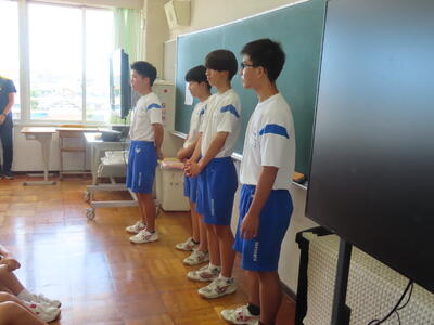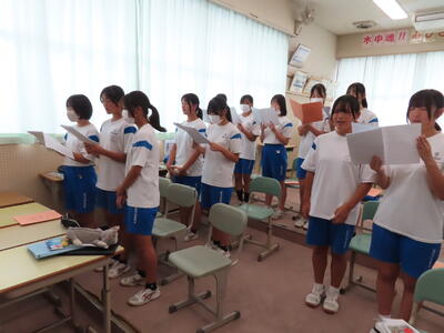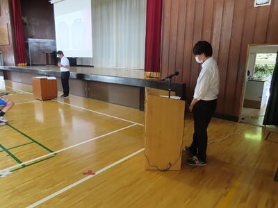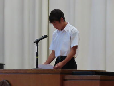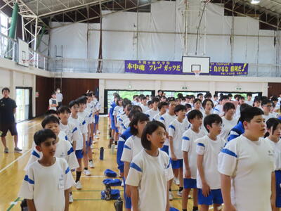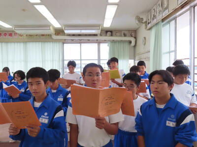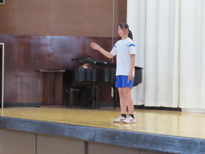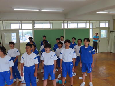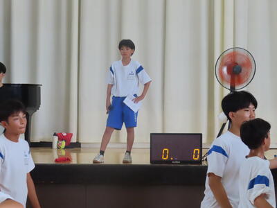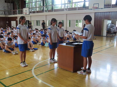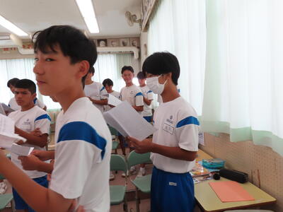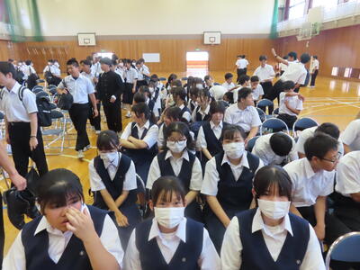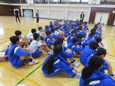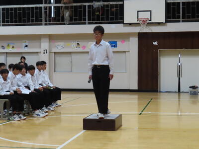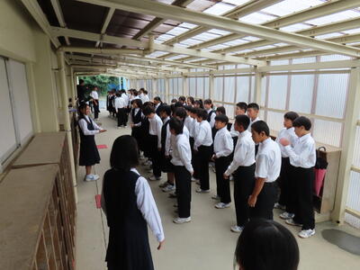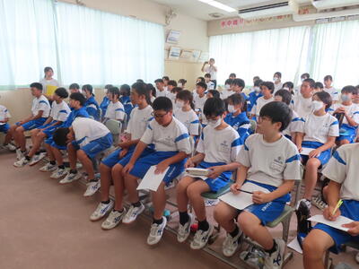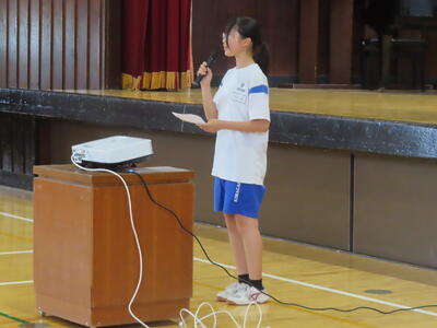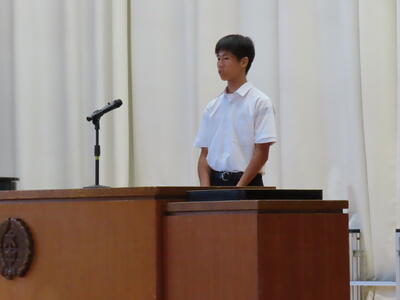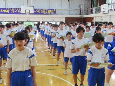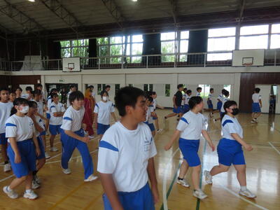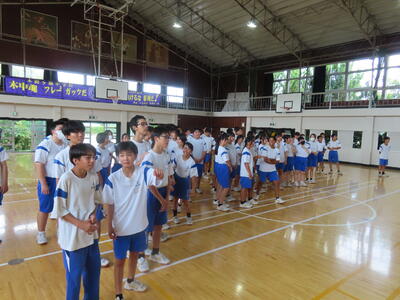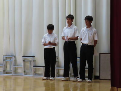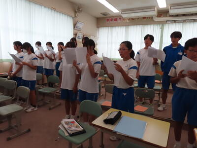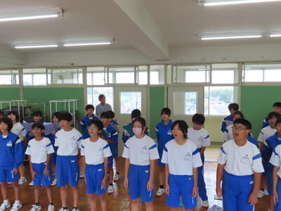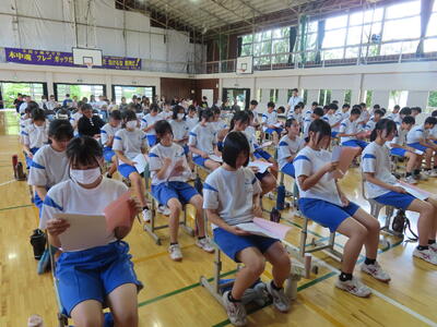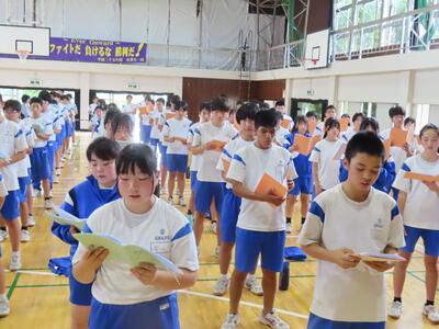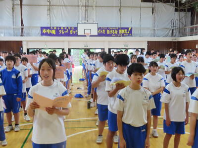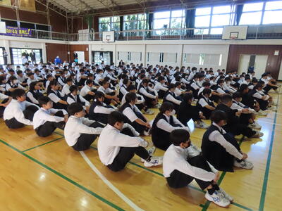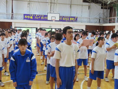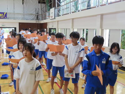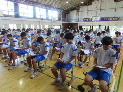 この日も暑い一日になりましたが、午後、生徒会主導で全校集会を行いました。多くの生徒の表彰、全校合唱、3年生の修学旅行報告などを行いました。体育館内も気温は上がりましたが、一人ひとりが意識を高く持ち、素晴らしい態度で臨んでいました。