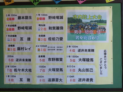 久し振りの更新になってしまいました。申し訳ありません。6月11日(水)は野田市中学校陸上競技大会でした。生憎の天気になってしまいましたが、本校の生徒たちは躍動しました。男子総合2位、男女総合6位。生徒数222名の小さな学校ですが、エネルギッシュでパワフルなのが木間ケ瀬中の魅力なんです。これまで練習を支えてくださった皆さん、当日競技場まで足を運んでくださった保護者の皆さん、ありがとうございました。