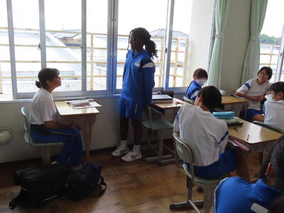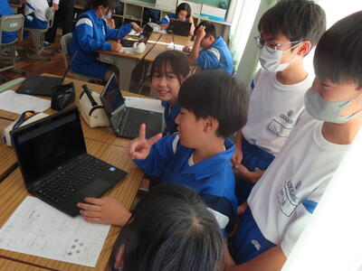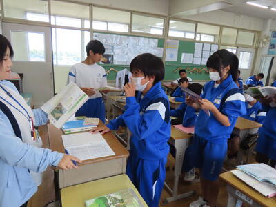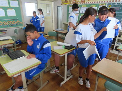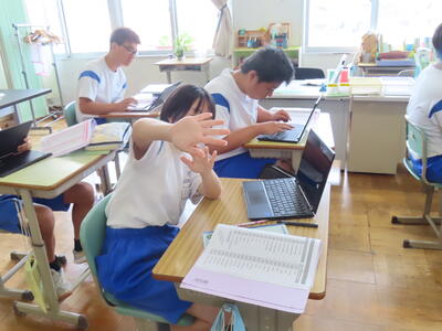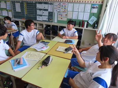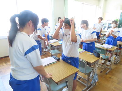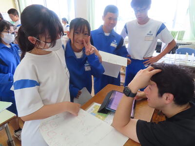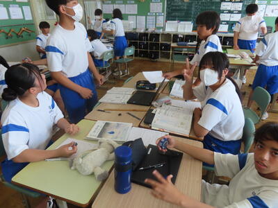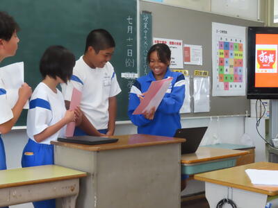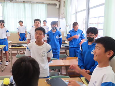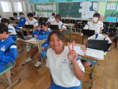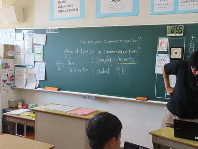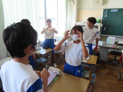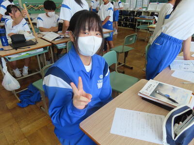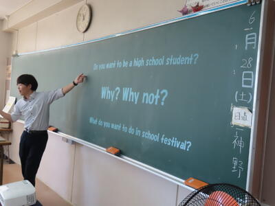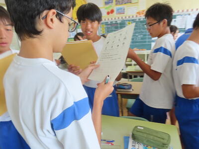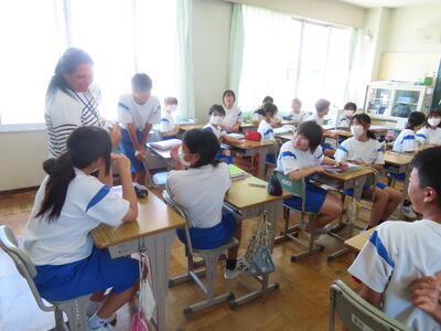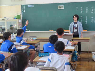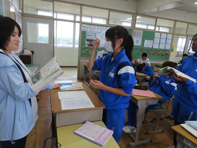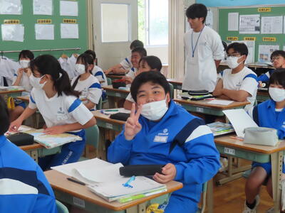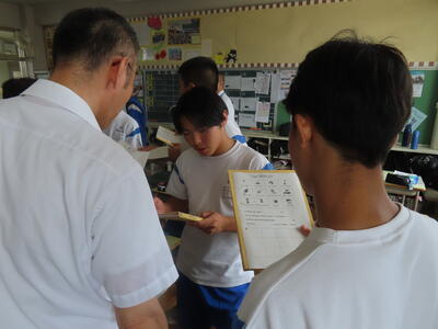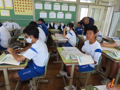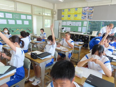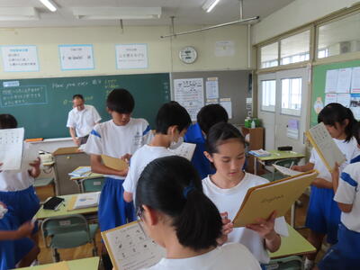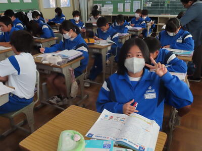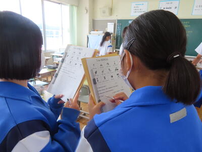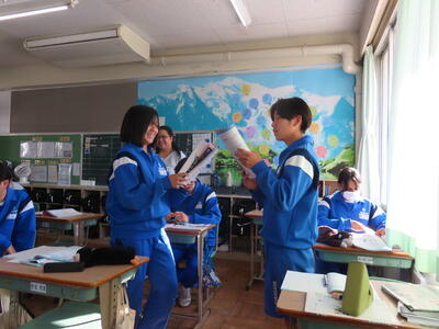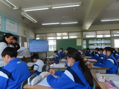 1年生の英語です。ALTや先生、友達とのコミュニケーションを楽しんでいました。
