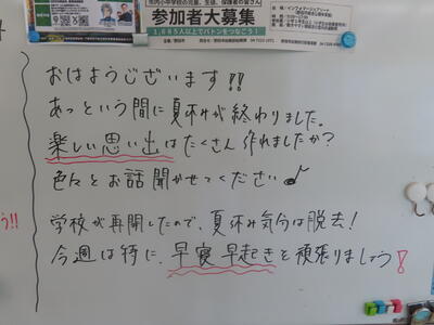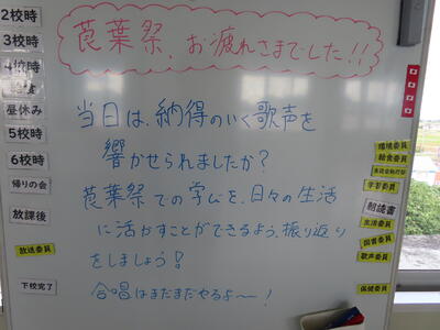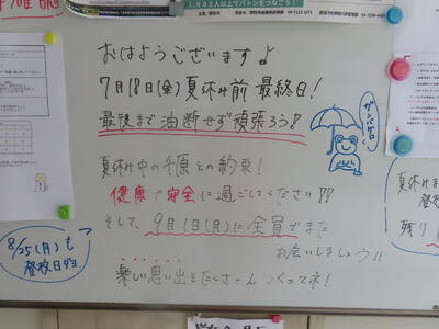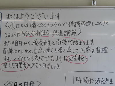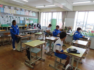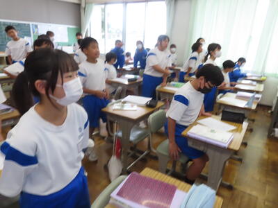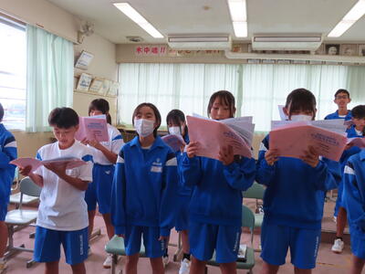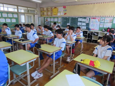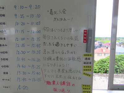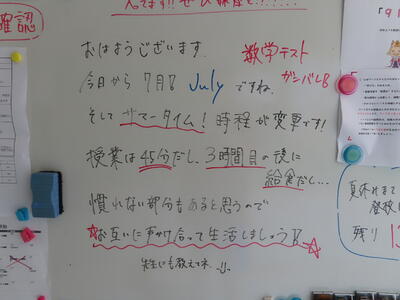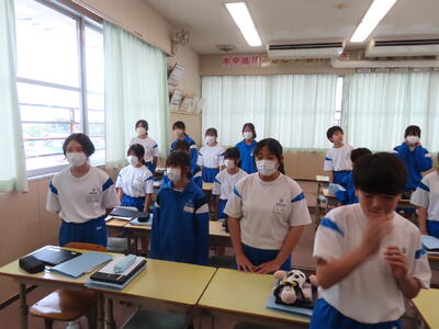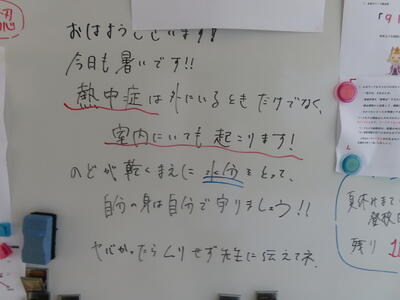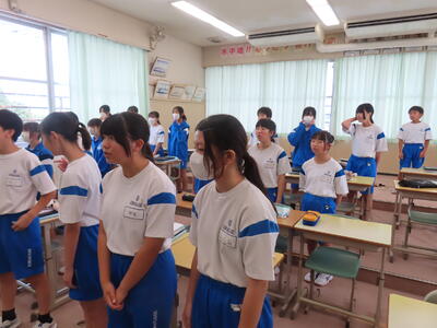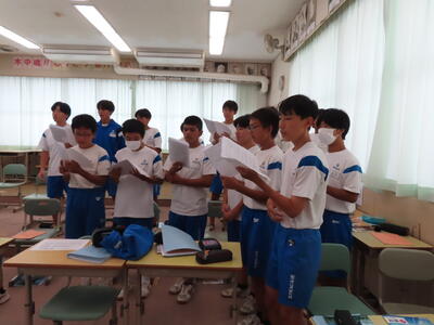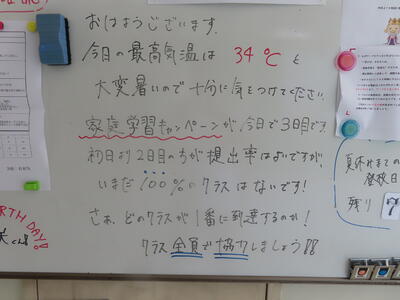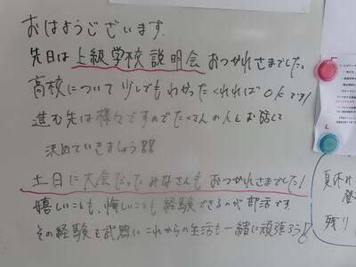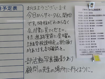 この日から時程を変更し、比較的気温の高くない朝のうちに部活動を行うようにしました。保護者の皆さんにはご理解ご協力いただき、感謝申し上げます。予定の変更などがありましたら、事前にお知らせしますが、何かありましたら学校までご連絡ください。