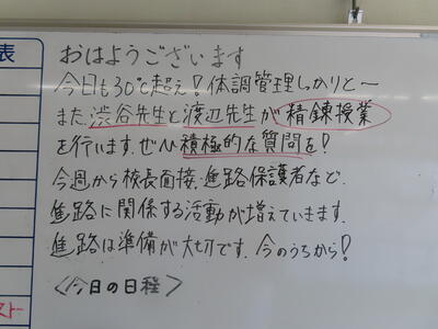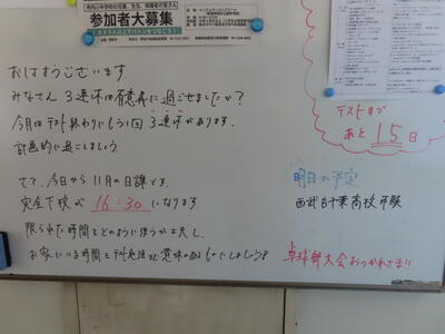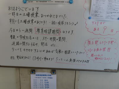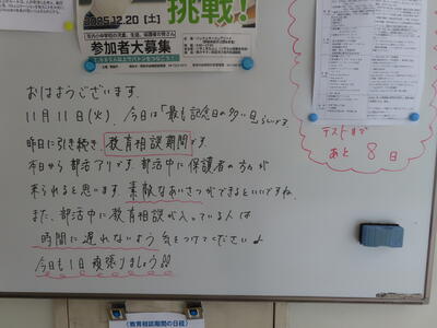 この日はHP担当者午前中出張だったため、なかなか写真を撮るチャンスがなく、、、校内の様子はなかなか分からず、、、でした。教育相談期間(三者面談)の2日目になります。保護者の皆様におかれましては、お忙しいところとは存じますが、よろしくお願いいたします。
