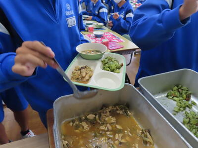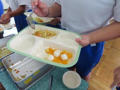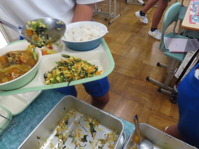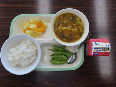 この日の献立は、発芽玄米ご飯、牛乳、関宿野菜カレー、野田市産の枝豆、はつみつレモンフルーツポンチでした。美味しくいただきました。ご馳走様でした。