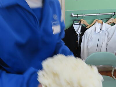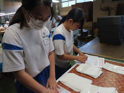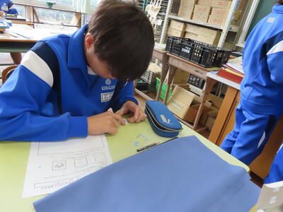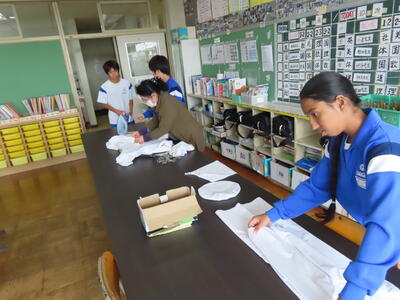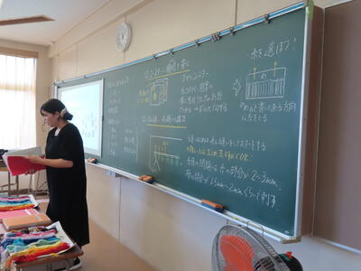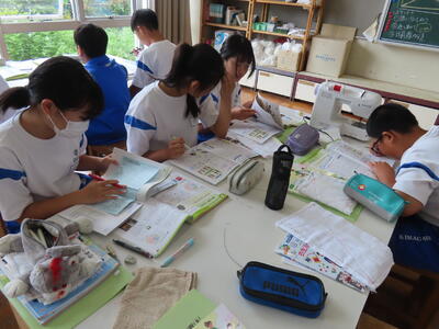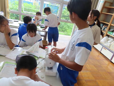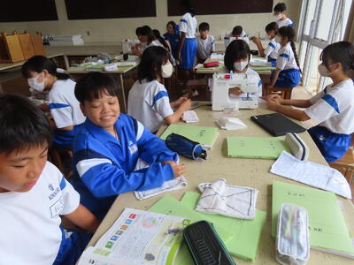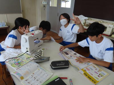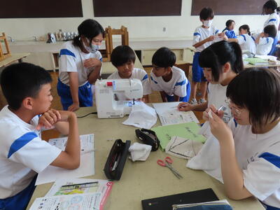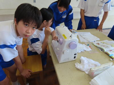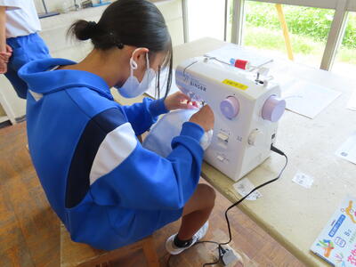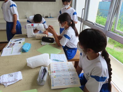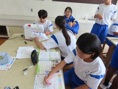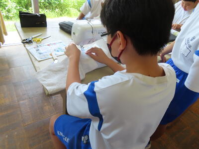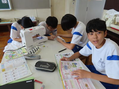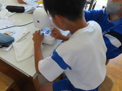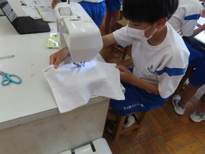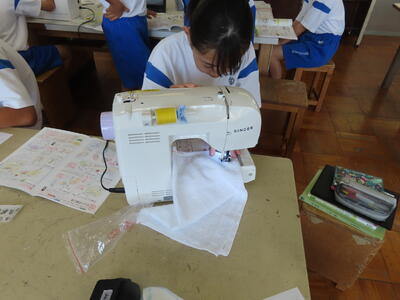 1年生の家庭科です。ミシンを使って雑巾を作っていました。