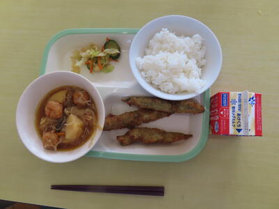 この日の献立は、ご飯、牛乳、肉じゃが、ししゃも磯辺フライ、野菜のごま酢和えでした。美味しくいただきました。ご馳走様でした。