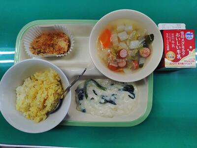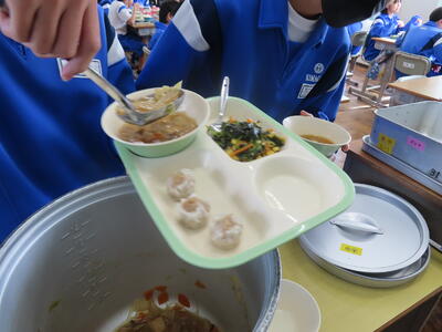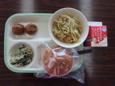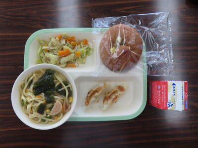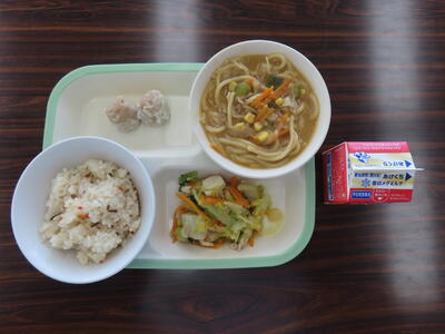 この日の献立は、中華味つけご飯、牛乳、野菜味噌ラーメン、ポークしゅうまい、白菜の中華炒めでした。美味しくいただきました。ご馳走様でした。