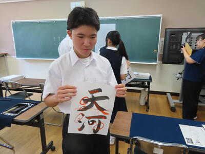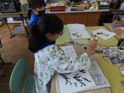 1年生の美術です。漢字一文字に工夫した装飾を加える作品作りです。