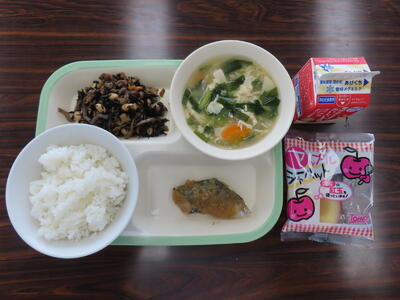 この日の献立は、ご飯、牛乳、豆腐とニラのかきたま汁、さわらのねぎみそかけ、ひじきの炒り煮、フローズンアップルでした。美味しくいただきました。ご馳走様でした。