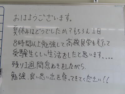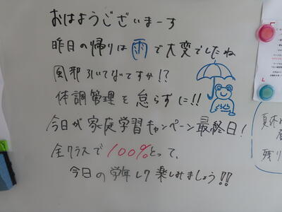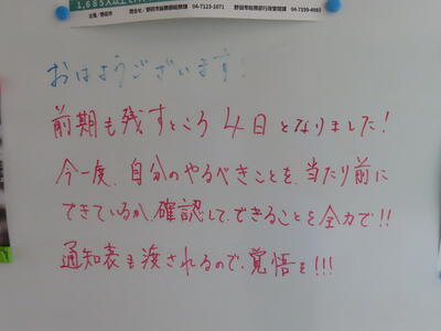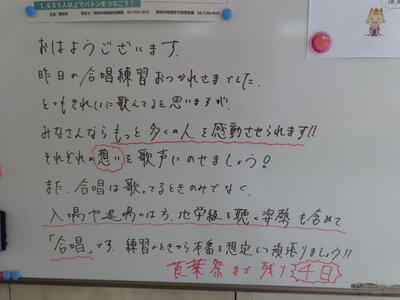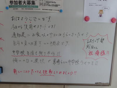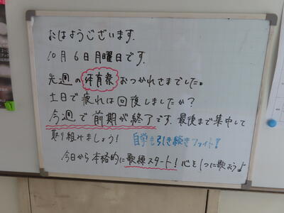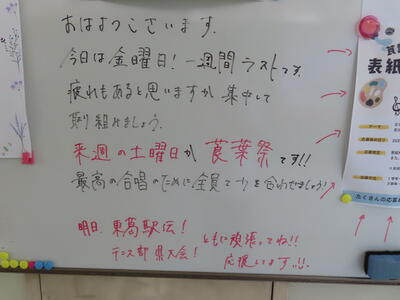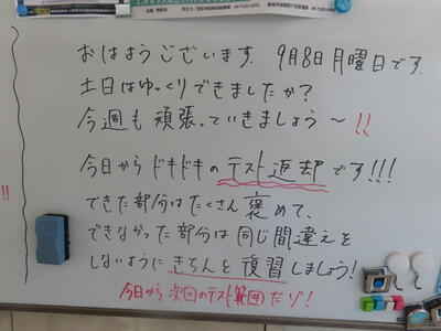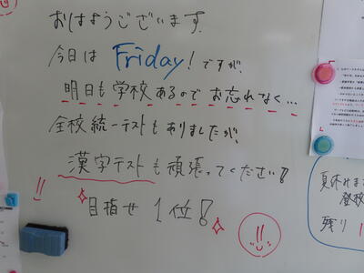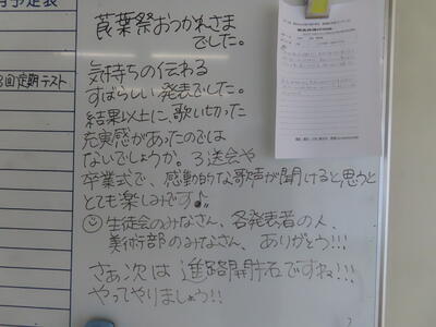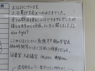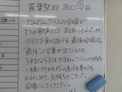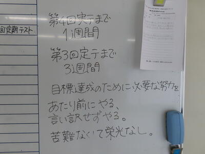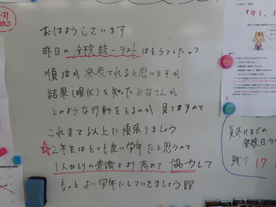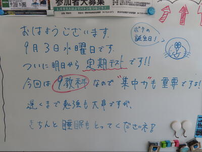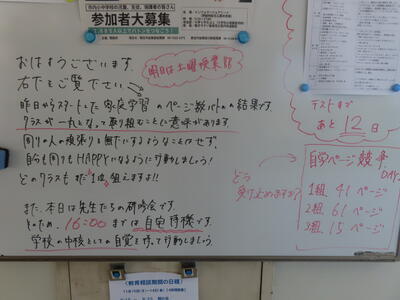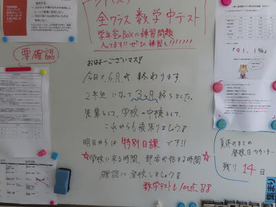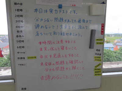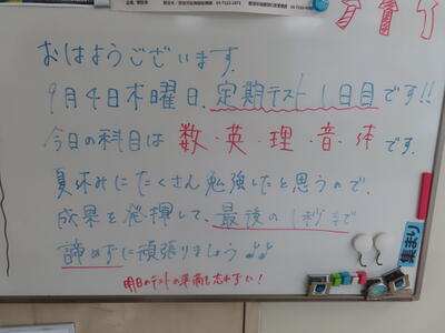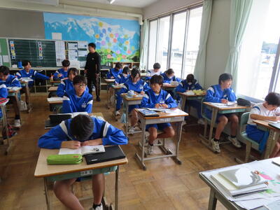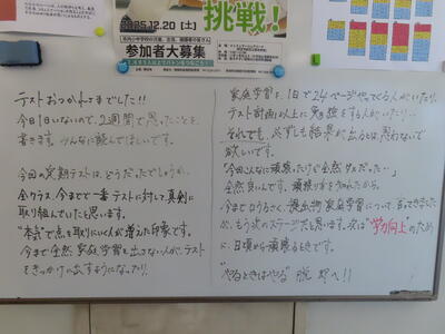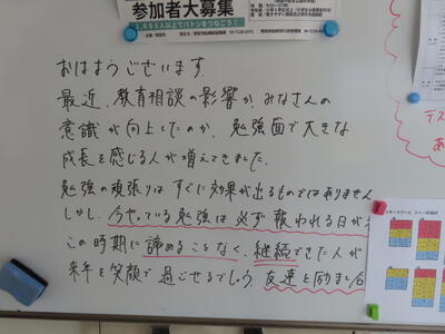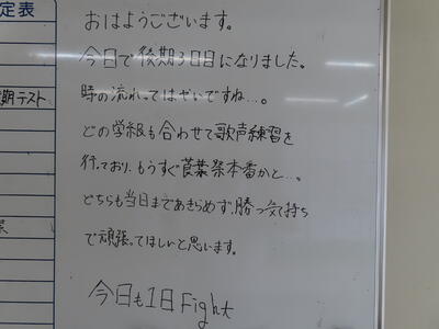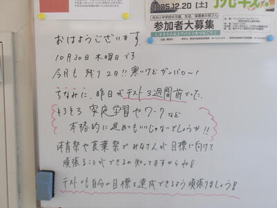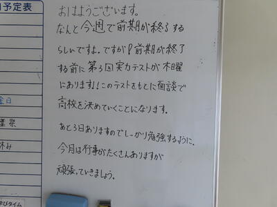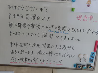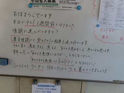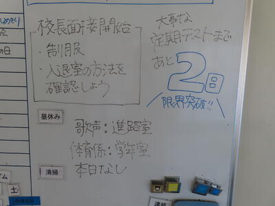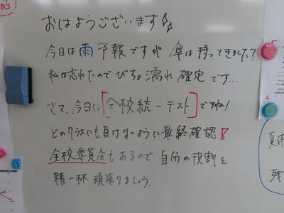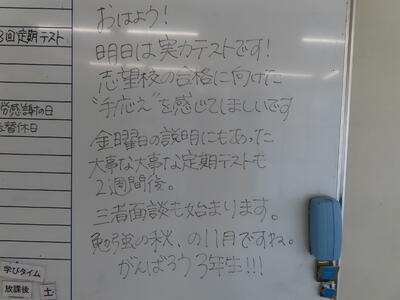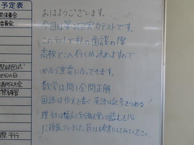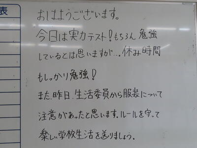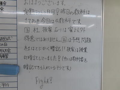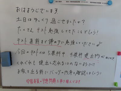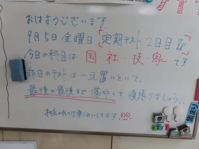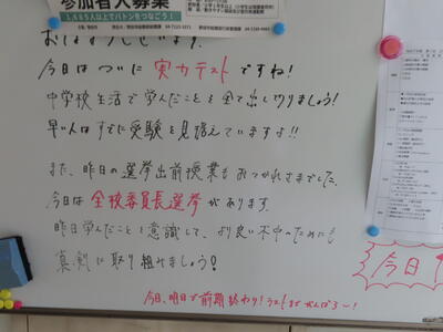 気がつけば、明日は第3回定期テスト1日目になっていました。さて、果たしてテスト対策は進んでいるのでしょうか。3年生にとっては、受験に向けてとても重要なテストになります。明日は全学年、理科、国語、社会の3教科です。しっかりと点数を取ってくれることを願うばかりです。