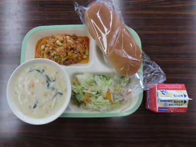 本日の献立は、コッペパン、牛乳、コーンシチュー、チリコンカン、野菜サラダでした。待ってましたのチリコンカンでした。美味しくいただきました。ご馳走様でした。