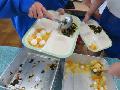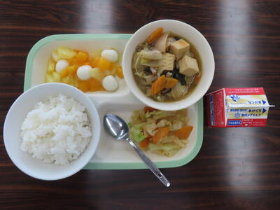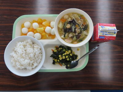 この日の献立は、ご飯、牛乳、五目うま煮丼、わかめとコーンのサラダ、フルーツ白玉でした。美味しくいただきました。ご馳走様でした。