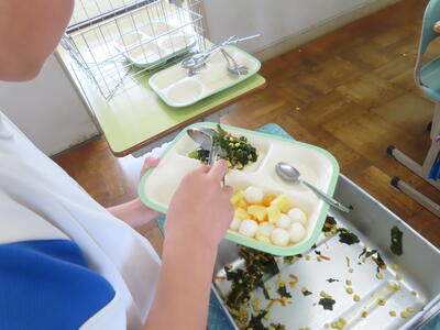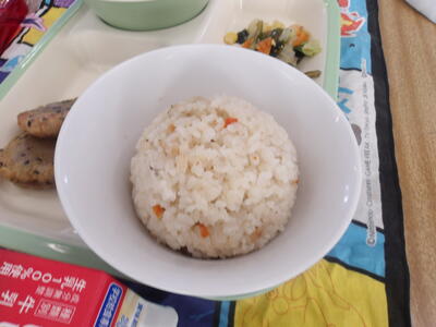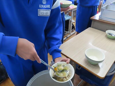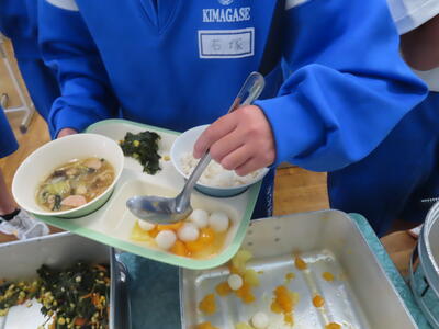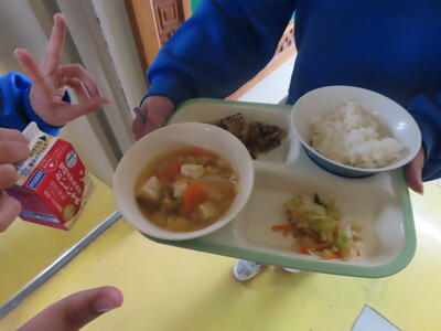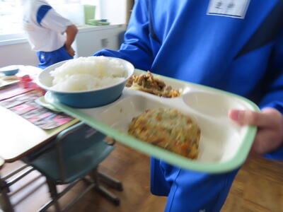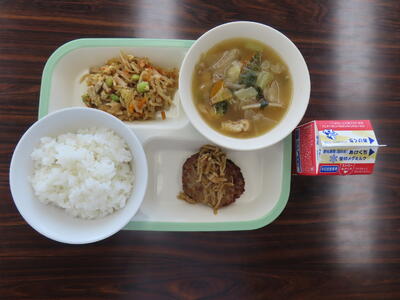 この日の献立は、ご飯、牛乳、利久汁、ハンバーグのおろしソースがけ、切り干し大根の卵とじでした。美味しくいただきました。ご馳走様でした。