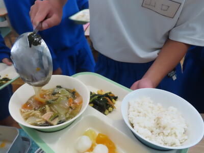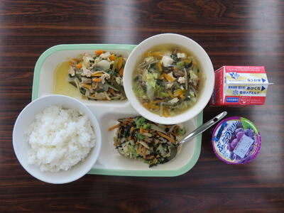 この日の献立は、ご飯、牛乳、春雨スープ、豚ニラピリから炒め、ひじきと小松菜のサラダ、ぶどうゼリーでした。美味しくいただきました。ご馳走様でした。
