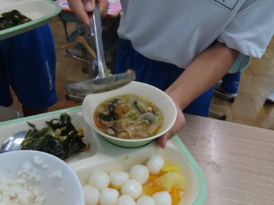 この日の献立は、ご飯、牛乳、韓国風すき焼き、甘酢肉団子、こんにゃく海藻サラダでした。美味しくいただきました。ご馳走様でした。
