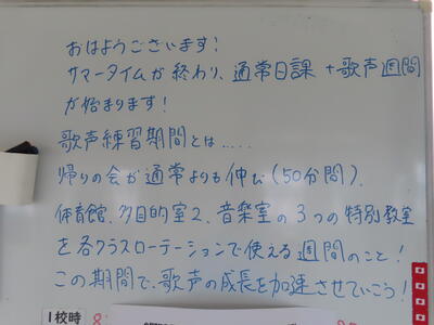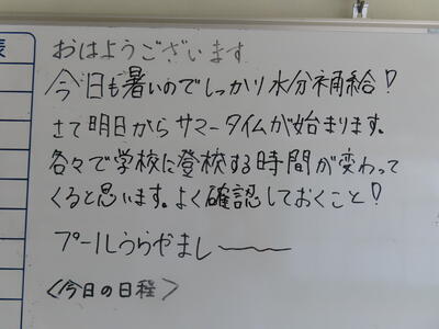 今日から水泳指導が始まりました。プールから生徒の歓声が聞こえてました。明日からサマータイムでの時程になります。保護者の皆様にはお手数をおかけしますが、ご支援ご協力をお願いいたします。