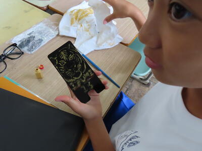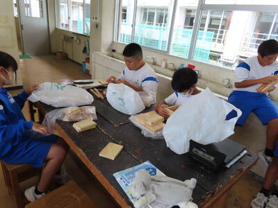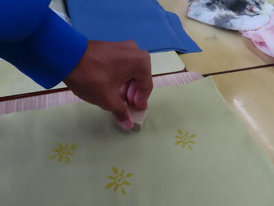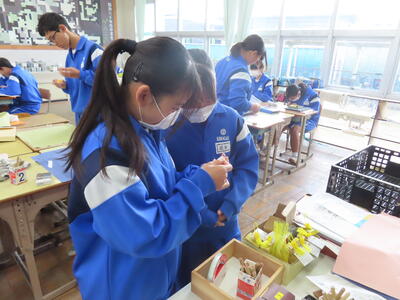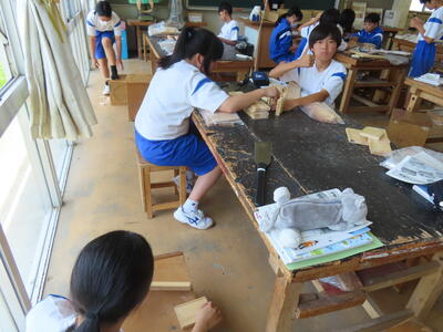 2年生の美術です。ゴムを彫刻刀で削り、ハンコを作っていました。布に押してランチョンマットにするようです。