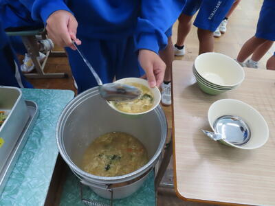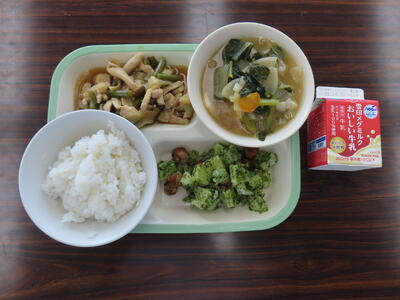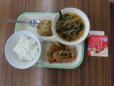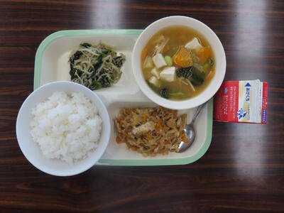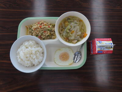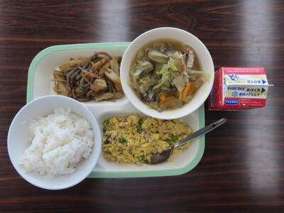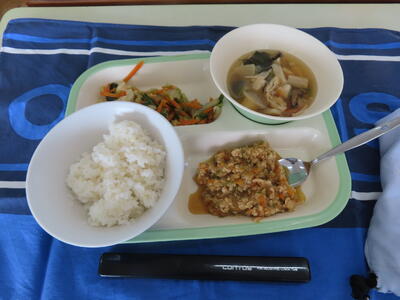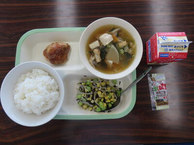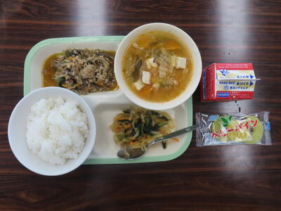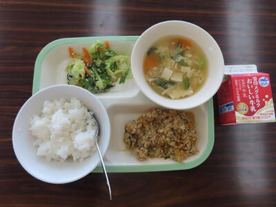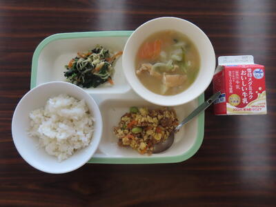 本日の献立は、ご飯、牛乳、かきたま汁、肉みそ、アーモンド和えでした。美味しくいただきました。ご馳走様でした。