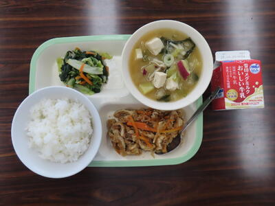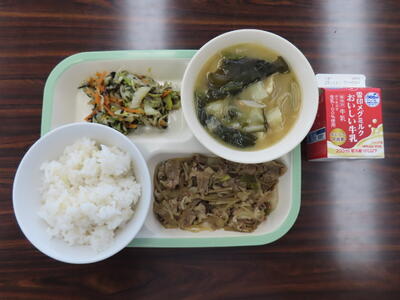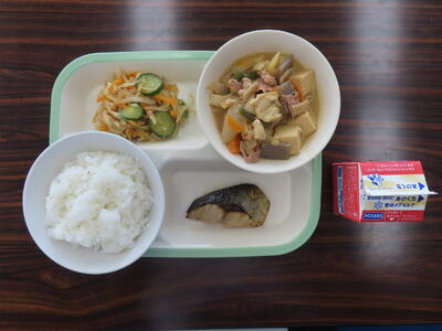 今日の献立は、ご飯、牛乳、豆腐とわかめのみそ汁、さばのスタミナ焼き、野菜の磯香和えでした。美味しくいただきました。ご馳走様でした。