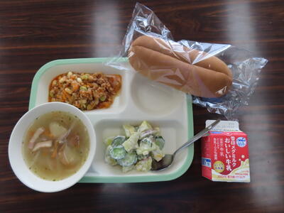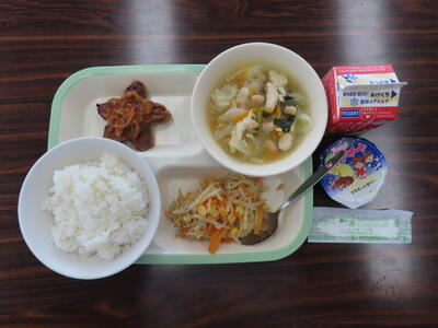 本日の献立は、スライスコッペパン、牛乳、ビーンズガーリックスープ、カレーミートサンドの具、ツナとキャベツのソテー、ヨーグルトでした。美味しくいただきました。ご馳走様でした。