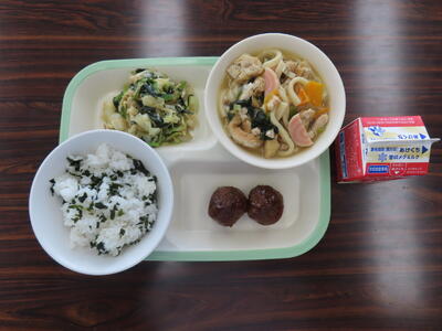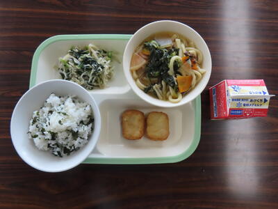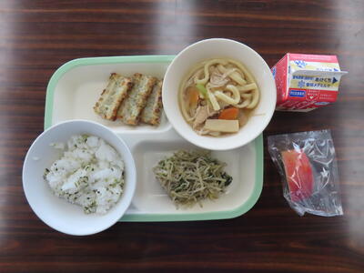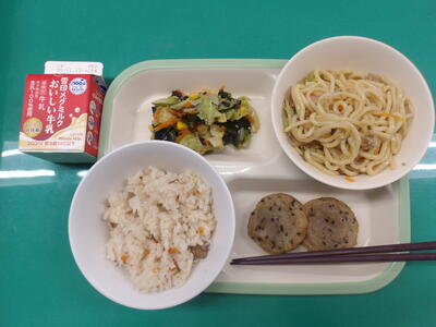 この日の献立は、~いい歯の日献立~で菜めし、牛乳、五目うどん、ちくわのマヨネーズ焼き、野菜とじゃこの炒め物、りんごでした。美味しくいただきました。ご馳走様でした。