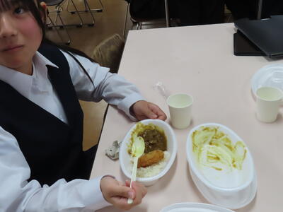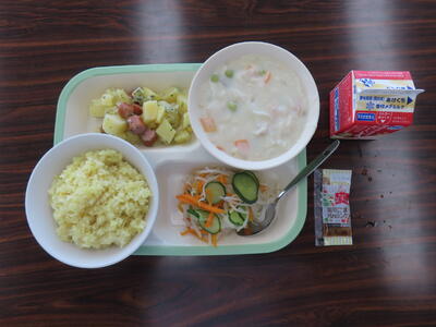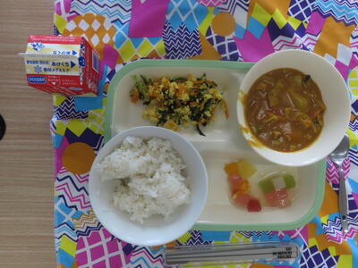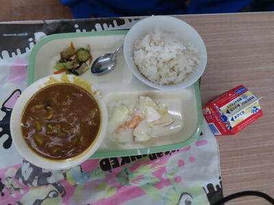 この日の献立は、麦ご飯、牛乳、チキンカレー、キャベツとツナのサラダ、フルーツのヨーグルト和えでした。美味しくいただきました。ご馳走様でした。