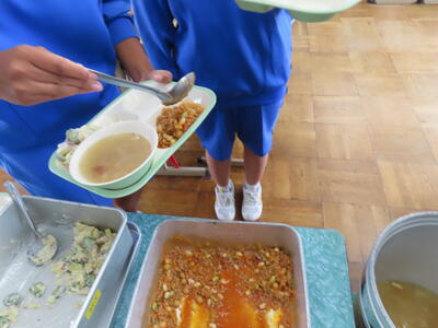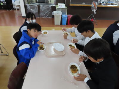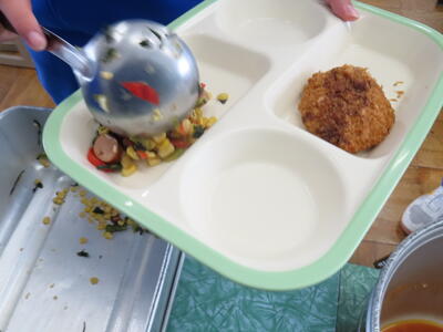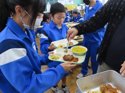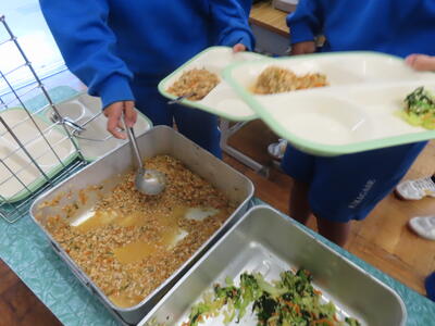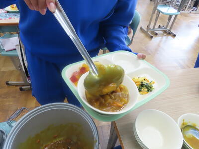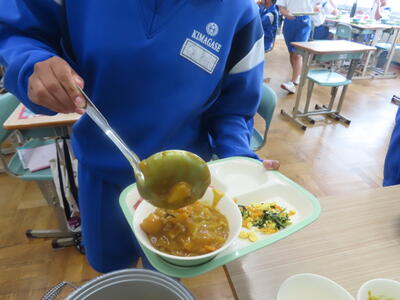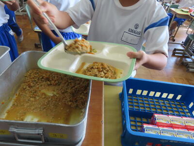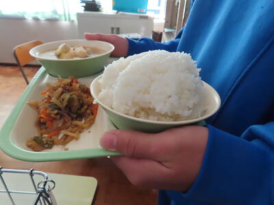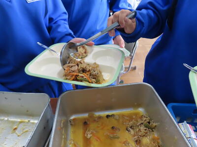 本日の献立は、~のだの恵みを味わう給食の日~でカレー粉ご飯、牛乳、ガルビュールスープ、鶏肉の香草パン粉焼きシューブレゼ添え、ホタテクリームソース(ご飯にかける)でした。美味しくいただきました。ご馳走様でした。