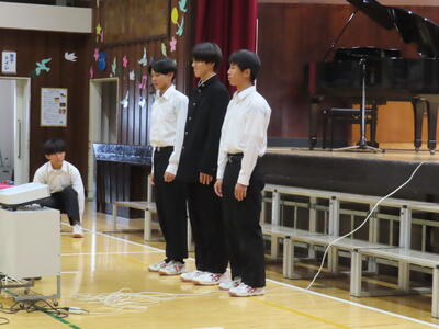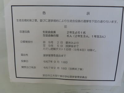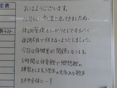 3連休明けです。市内小中学校ではインフルエンザが流行し、学級・学年閉鎖をして感染拡大を止めようと苦慮している学校が多いようです。そのような中、本日の木間ケ瀬中学校のインフルエンザ罹患者は0名でした。まもなく12月。3年生にとっては私立高校の受験手続きなども本格的になります。万全な体調で残り少ない令和7年の登校日を大切に過ごしてほしいと思います。